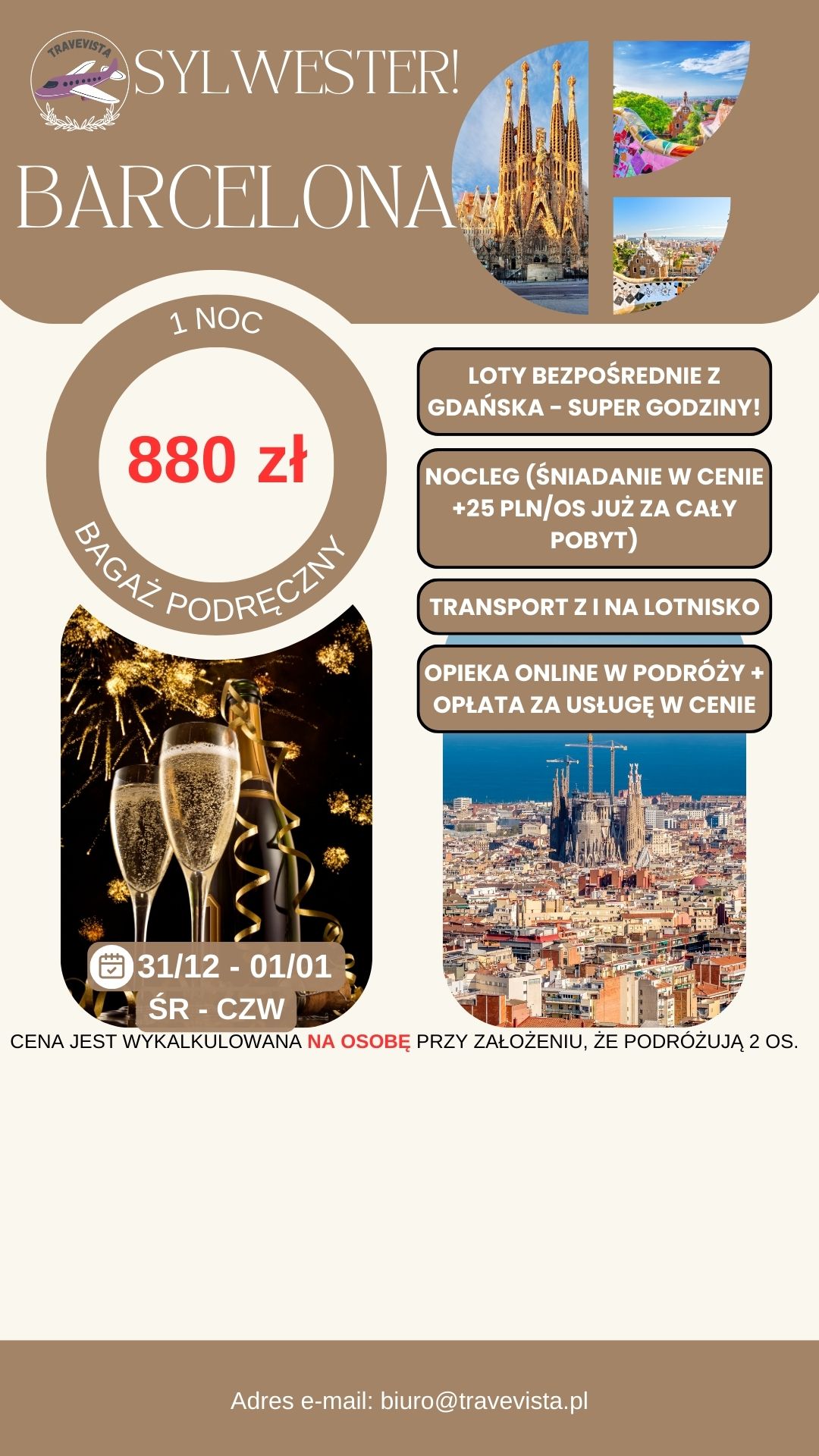 Sylwester w gorącej Barcelonie! 🌆🥂 Nowy Rok przywitasz w hiszpańskim klimacie, spacerując po klimatycznych ulicach, podziwiając fajerwerki i celebrując w rytmie fiesty. Idealna szybka ucieczka na niezapomnianą noc w sercu Katalonii! 🎆💃