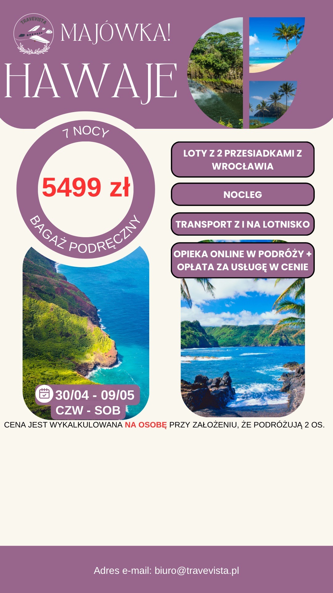 Spełnij amerykański sen na rajskich Hawajach! 🌴 Czekają na Ciebie złote plaże, turkusowa woda, egzotyczna przyroda i spektakularne widoki. Idealny sposób, żeby spędzić majówkę… trochę dalej niż zwykle 😉