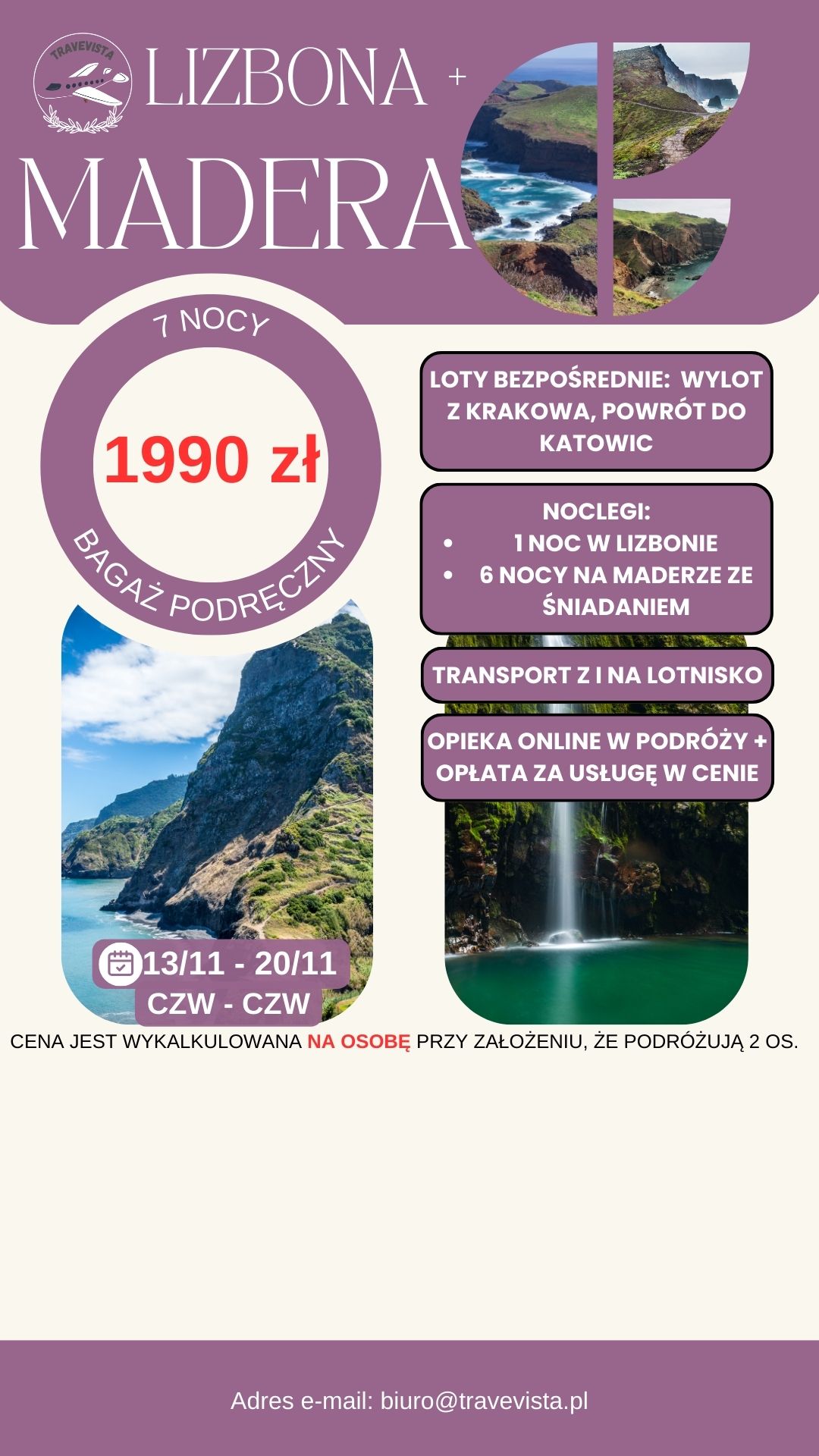 Połącz zwiedzanie Lizbony z magicznym wypoczynkiem na Maderze! 🏝️ Stolica Portugalii zachwyci klimatem, a „wyspa wiecznej wiosny” urzeknie zielonymi szlakami, klifami i oceanicznymi widokami. ✨