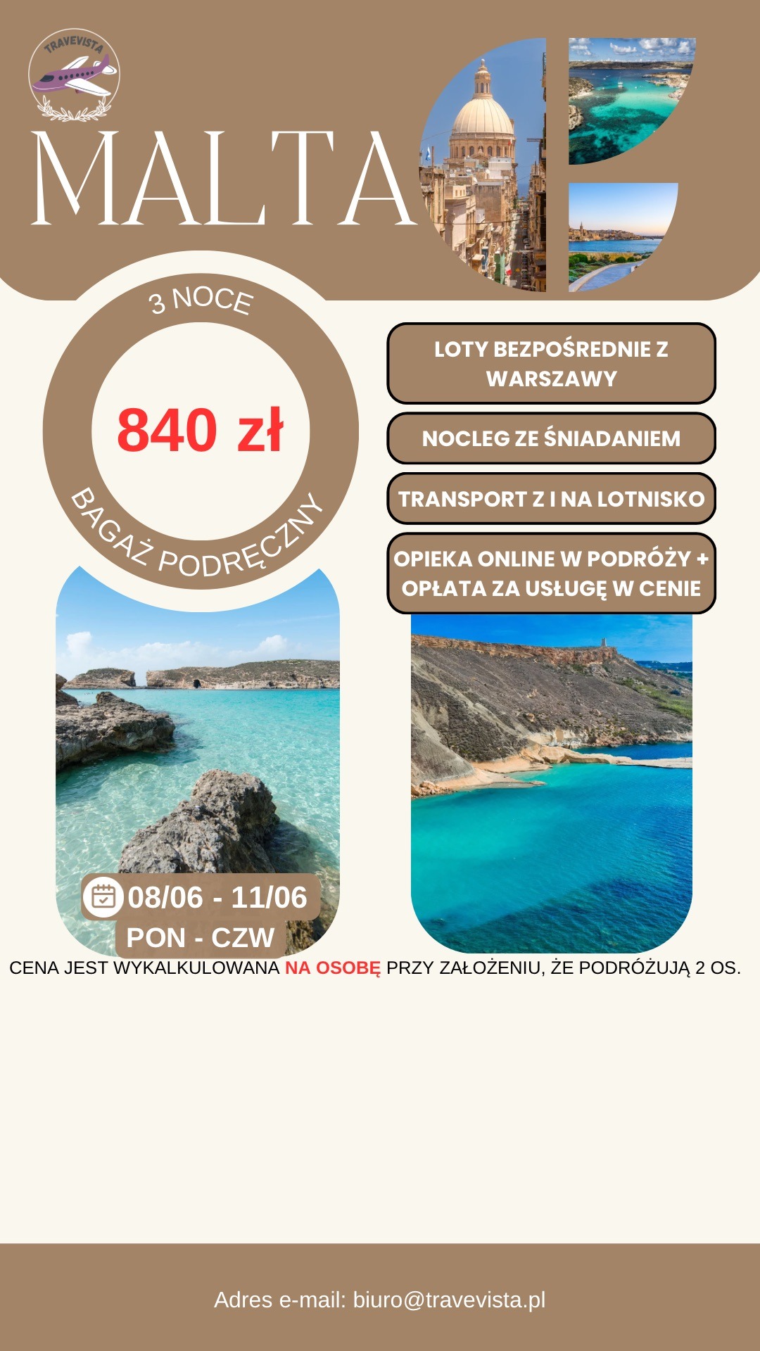 Słoneczny city break na jednej z najbardziej klimatycznych wysp Morza Śródziemnego Malta zachwyca zabytkową architekturą, turkusową wodą i widokowymi klifami. Na miejscu warto odwiedzić stolicę Valletta oraz zobaczyć słynną Blue Lagoon, znaną z intensywnie turkusowej wody.