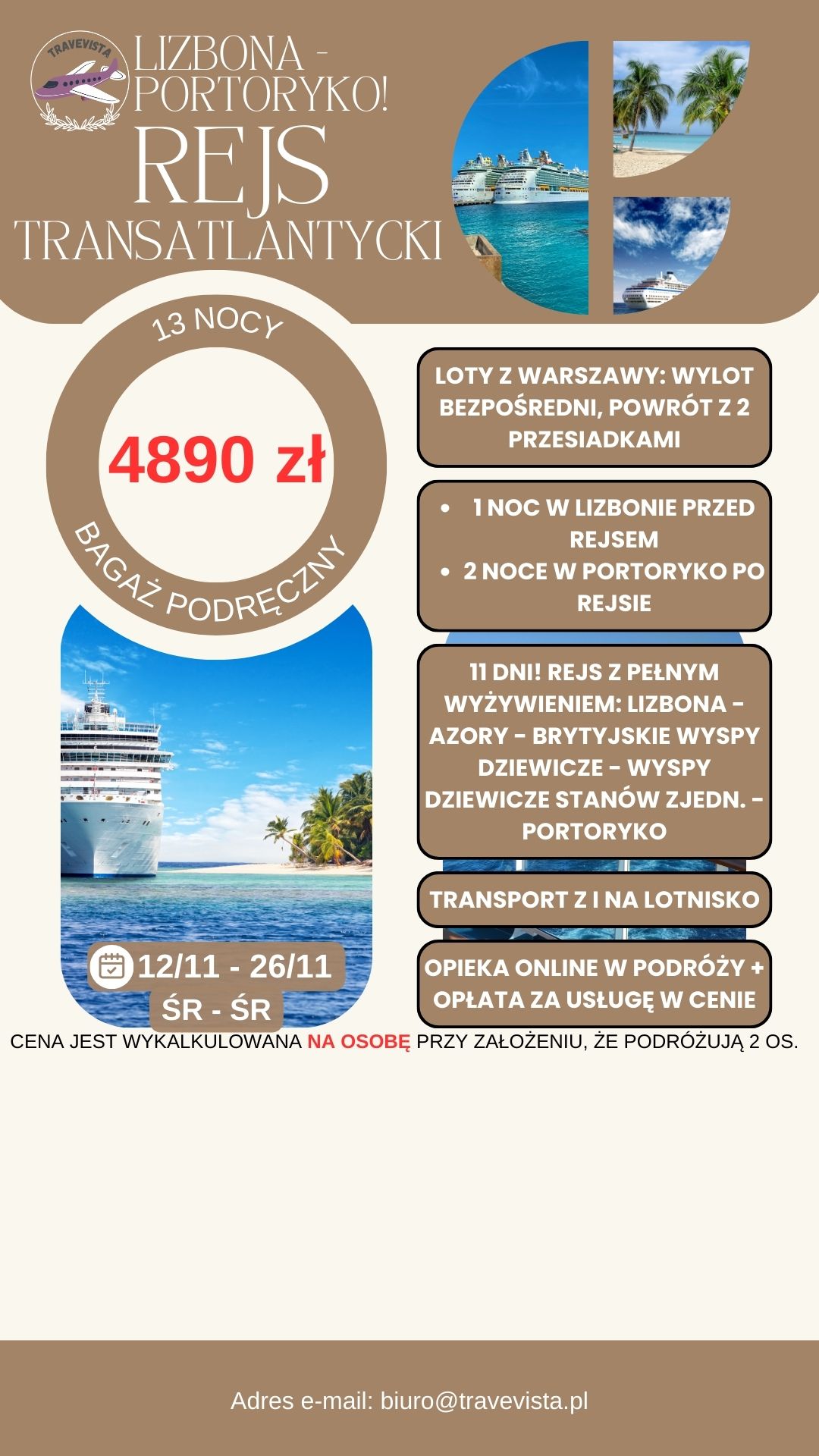 REJS TRANSATLANTYCKI + LIZBONA & PORTORYKO – 14 DNI ZA 4890 ZŁ/OS! 🚢🌴