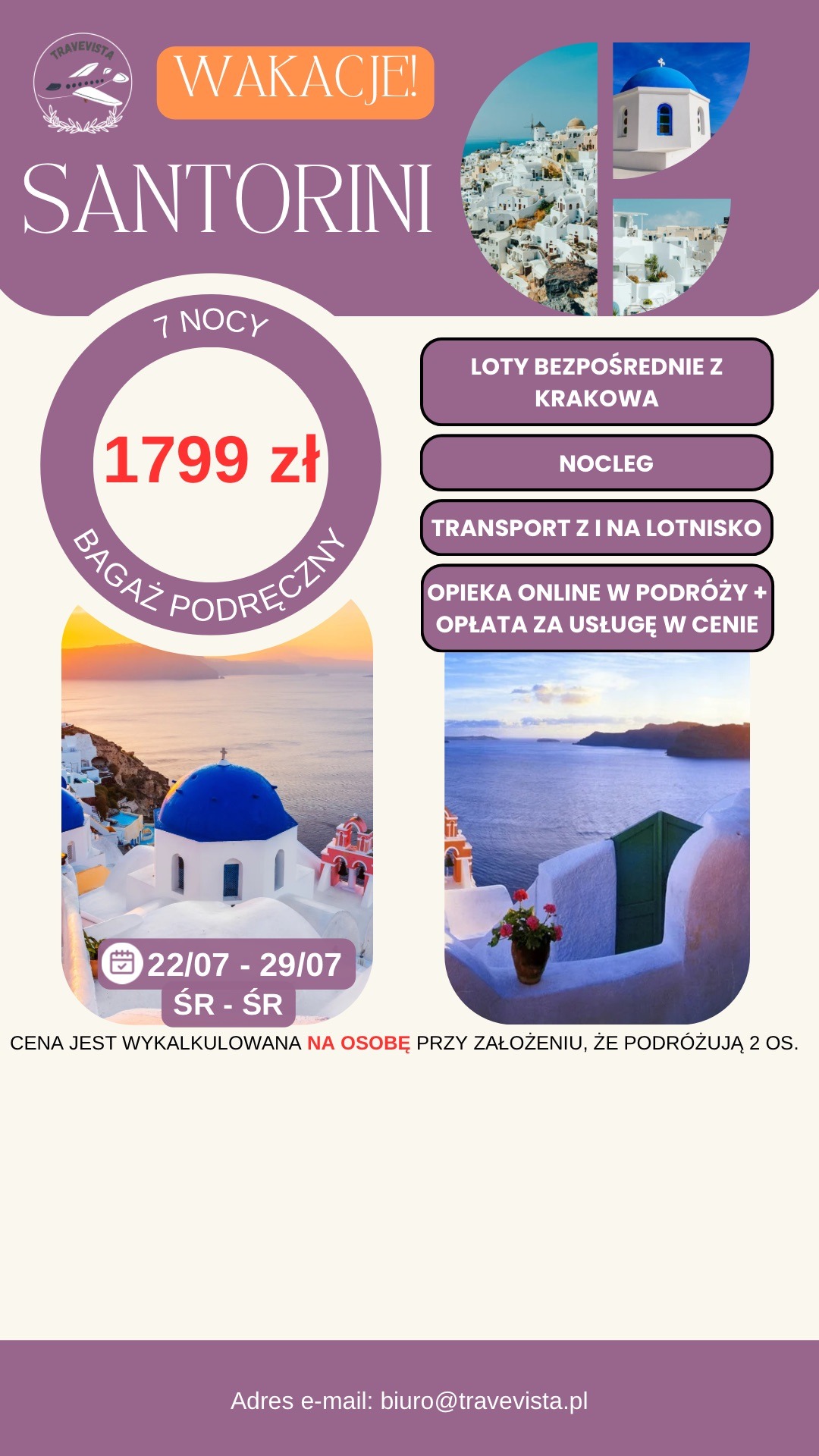 Letni wyjazd na jedną z najbardziej malowniczych wysp Grecji Santorini zachwyca białymi domkami na klifach, turkusowym morzem i spektakularnymi zachodami słońca. To idealny kierunek na wakacje, jeśli marzysz o greckim klimacie, pięknych plażach i romantycznych widokach