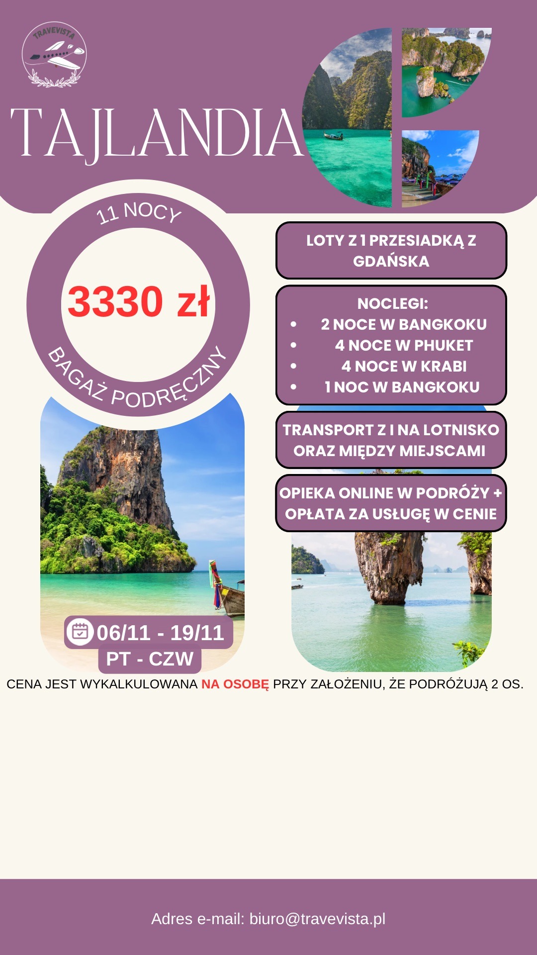 Idealna podróż łącząca egzotyczną metropolię i rajskie plaże Zwiedzisz tętniący życiem Bangkok, a później odpoczniesz na tropikalnych wybrzeżach Phuket i Krabi – słynących z turkusowej wody, wapiennych klifów i jednych z najpiękniejszych plaż w Azji