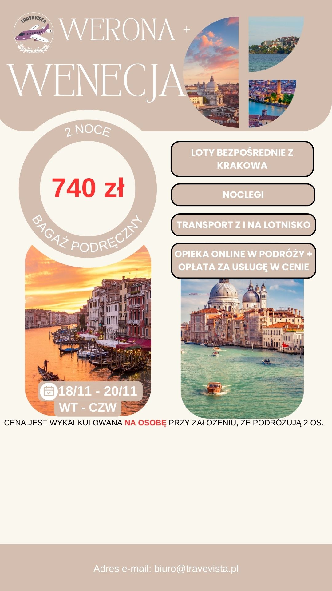 Dwa włoskie klasyki w jednej podróży! 💕 Romantyczna Werona – miasto Romea i Julii 🕊️, a do tego niezapomniana Wenecja z gondolami i klimatycznymi kanałami. To szybki city break, który łączy najlepsze włoskie klimaty w super cenie! 🍝🍷
